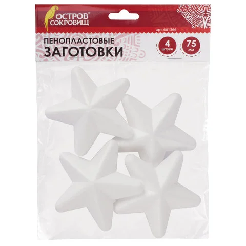 Пенопластовые заготовки для творчества 'Звездочки', 4 шт., 75 мм, ОСТРОВ СОКРОВИЩ, 661366