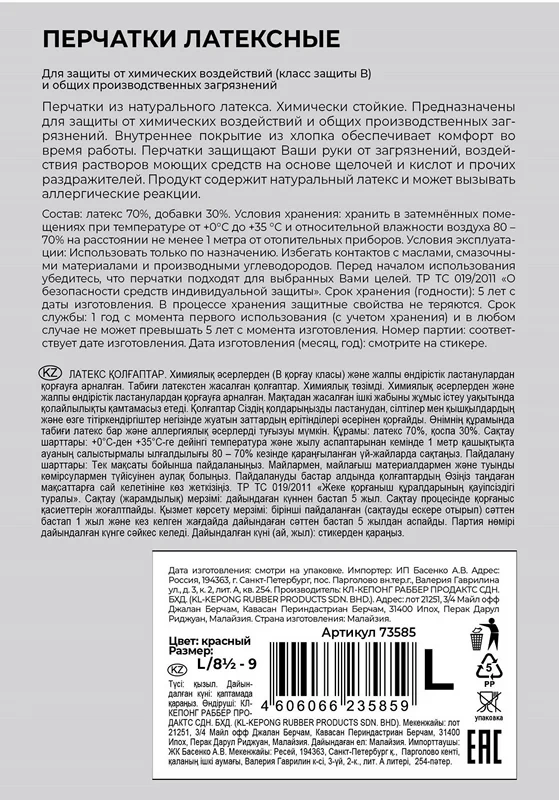 Особенности и преимущества: - Есть цветовая кодировка для предотвращения перекрёстного загрязнения; - Латекс прочный и эластичный, что обеспечивает перчаткам износостойкость и долговечность; - Удобная анатомическая посадка на руке; - Есть ролик на манжете, что облегчает надевание перчатки на руку (надевающая рука не соскальзывает по манжете); - Хлопковое напыление создаёт комфорт при работе, помогает легко надевать и снимать перчатку и впитывает излишнюю влагу; - Есть рельеф на ладони и пальцах для надежного захвата; - Хорошая устойчивость к средствам содержащим кислоты и щёлочь (класс защиты B - J – гептан, K- гидроокись натрия (щелочь), L – серная кислота). Область применения: - Для защиты рук во время уборки помещений; - Можно применять при сухой и влажной уборке; - Есть защита от кислот и щелочей, можно использовать с разведенными моющими средствами и дезинфектантами. Подходят для ежедневной уборки, в том числе с использованием химии и дезинфектантов (согласно инструкции по применению). Рельефная поверхность области захвата. Химически стойкие. Предназначены для защиты от химических воздействий и общих производственных загрязнений. Внутреннее покрытие из хлопка обеспечивает комфорт во время работы. Перчатки защищают Ваши руки от загрязнений, воздействия растворов моющих средств на основе щелочей и кислот и прочих раздражителей.
