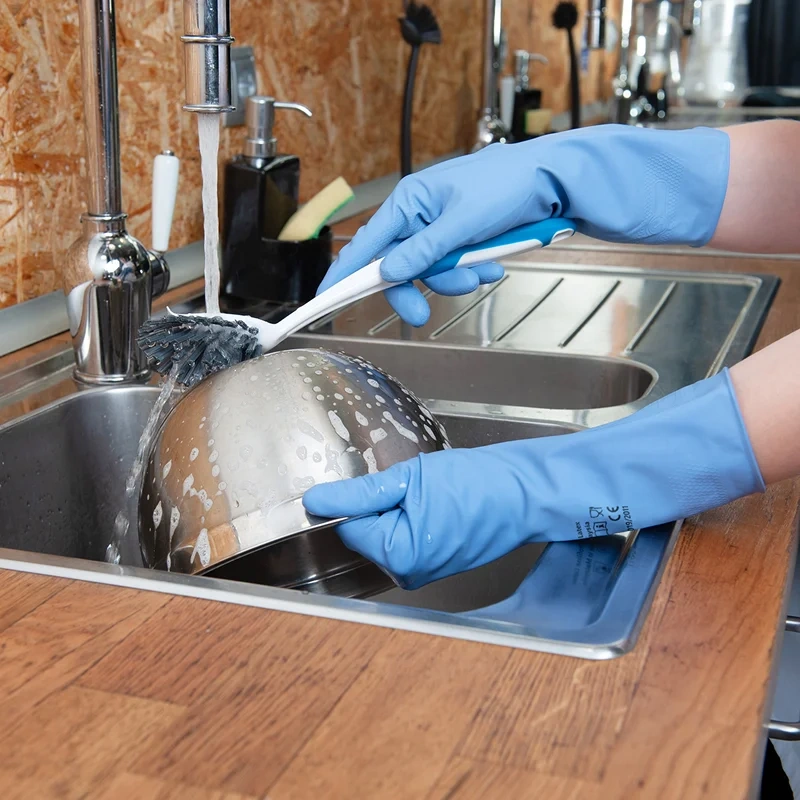 Особенности и преимущества: - Есть цветовая кодировка для предотвращения перекрёстного загрязнения; - Латекс прочный и эластичный, что обеспечивает перчаткам износостойкость и долговечность; - Удобная анатомическая посадка на руке; - Есть ролик на манжете, что облегчает надевание перчатки на руку (надевающая рука не соскальзывает по манжете); - Хлопковое напыление создаёт комфорт при работе, помогает легко надевать и снимать перчатку и впитывает излишнюю влагу; - Есть рельеф на ладони и пальцах для надежного захвата; - Хорошая устойчивость к средствам содержащим кислоты и щёлочь (класс защиты B - J – гептан, K- гидроокись натрия (щелочь), L – серная кислота).Область применения:- Для защиты рук во время уборки помещений; - Можно применять при сухой и влажной уборке; - Есть защита от кислот и щелочей, можно использовать с разведенными моющими средствами и дезинфектантами. Синие перчатки разрешены к контакту с пищевыми средами. Подходят для ежедневной уборки, в том числе с использованием химии и дезинфектантов (согласно инструкции по применению). Рельефная поверхность области захвата. Химически стойкие. Предназначены для защиты от химических воздействий и общих производственных загрязнений. Внутреннее покрытие из хлопка обеспечивает комфорт во время работы. Перчатки защищают Ваши руки от загрязнений, воздействия растворов моющих средств на основе щелочей и кислот и прочих раздражителей.
