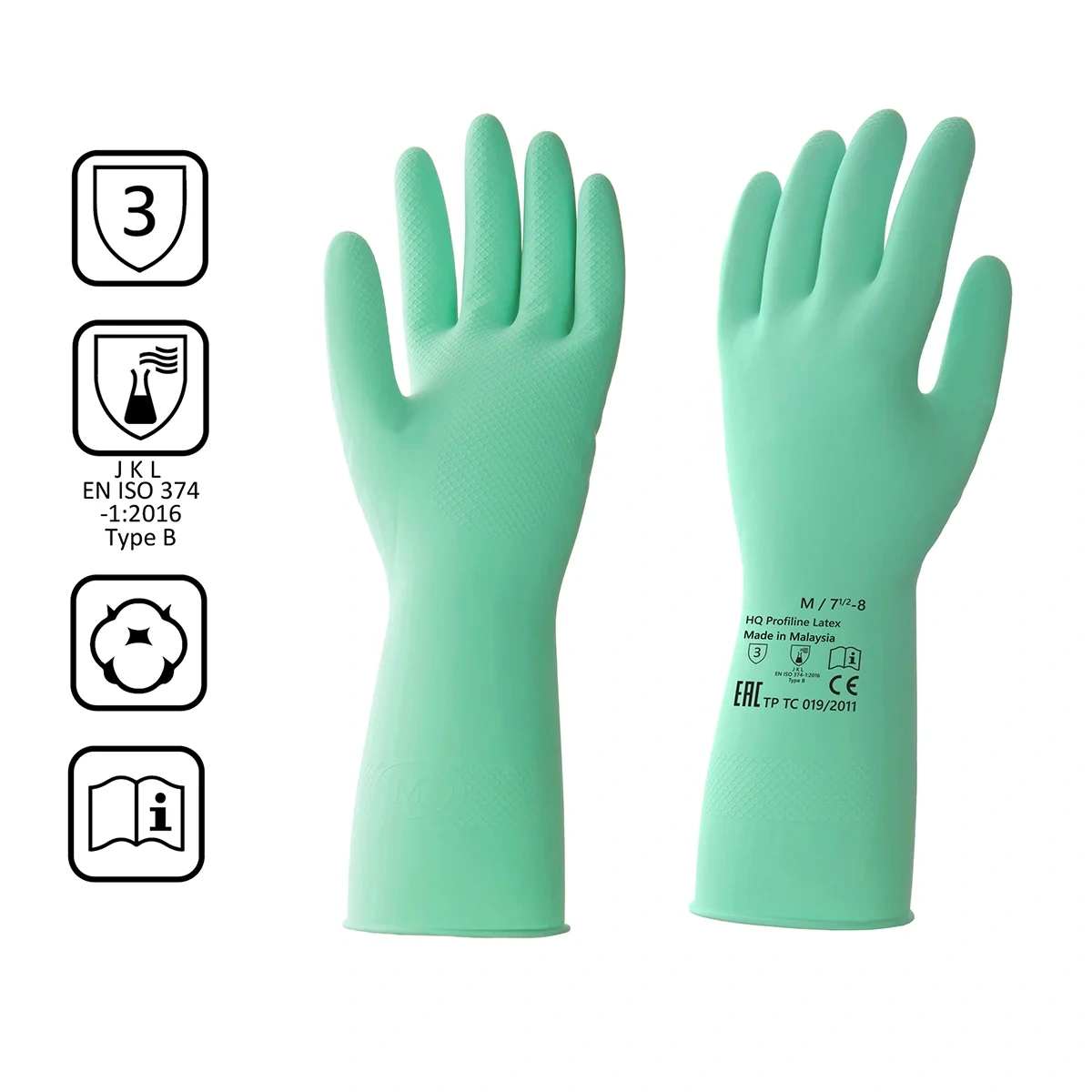 Особенности и преимущества: - Есть цветовая кодировка для предотвращения перекрёстного загрязнения; - Латекс прочный и эластичный, что обеспечивает перчаткам износостойкость и долговечность; - Удобная анатомическая посадка на руке; - Есть ролик на манжете, что облегчает надевание перчатки на руку (надевающая рука не соскальзывает по манжете); - Хлопковое напыление создаёт комфорт при работе, помогает легко надевать и снимать перчатку и впитывает излишнюю влагу; - Есть рельеф на ладони и пальцах для надежного захвата; - Хорошая устойчивость к средствам содержащим кислоты и щёлочь (класс защиты B - J – гептан, K- гидроокись натрия (щелочь), L – серная кислота); Область применения:- Для защиты рук во время уборки помещений; - Можно применять при сухой и влажной уборке; - Есть защита от кислот и щелочей, можно использовать с разведенными моющими средствами и дезинфектантами. Подходят для ежедневной уборки, в том числе с использованием химии и дезинфектантов (согласно инструкции по применению). Рельефная поверхность в области захвата. Химически стойкие. Предназначены для защиты от химических воздействий и общих производственных загрязнений. Внутреннее покрытие из хлопка обеспечивает комфорт во время работы. Перчатки защищают руки от загрязнений, воздействия растворов моющих средств на основе щелочей и кислот и прочих раздражителей.