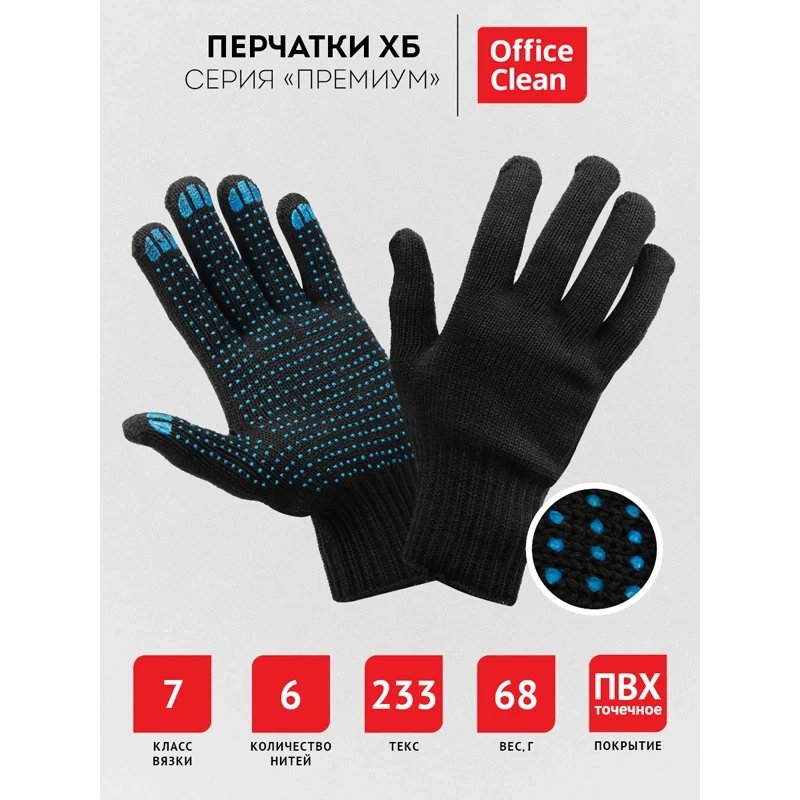 Перчатки OfficeClean изготовлены из хлопчатобумажной пряжи плотностью 233 текс, 6 нитей, с точечным ПВХ покрытием. Манжеты перчаток сделаны в виде резинок, которые обеспечивают плотное прилегание перчаток к рукам. Перчатки черного цвета, 7-ой класс вязки. Вес пары: 68 г. Поставляются в комплекте 10 пар/20 шт. в полиэтиленовом пакете.