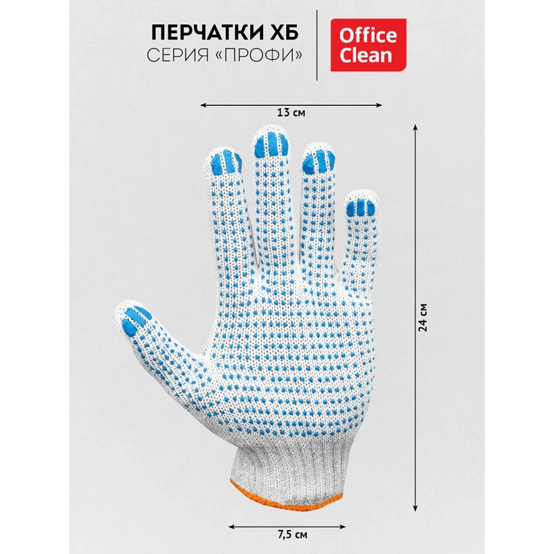Хлопчатобумажные перчатки OfficeClean удобны в применении на производстве, в быту, в садоводстве, на автосервисах, при строительно-ремонтных работах. Перчатки х/б с ПВХ напылением в отличии от обычных перчаток хб, достаточно износостойкие и долговечные, в них удобно работать в любых условиях, так как такая поверхность не позволяет руке скользить и значительно повышает уровень защиты от повреждений.