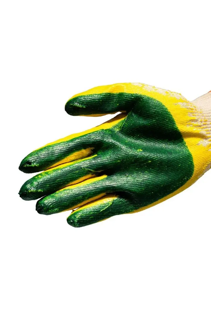 Перчатки х/б с двойным покрытием.Материал: 100% хлопок.Материал наладонника: двойное покрытие из натурального латекса.Цвет покрытия: зеленое, красное.