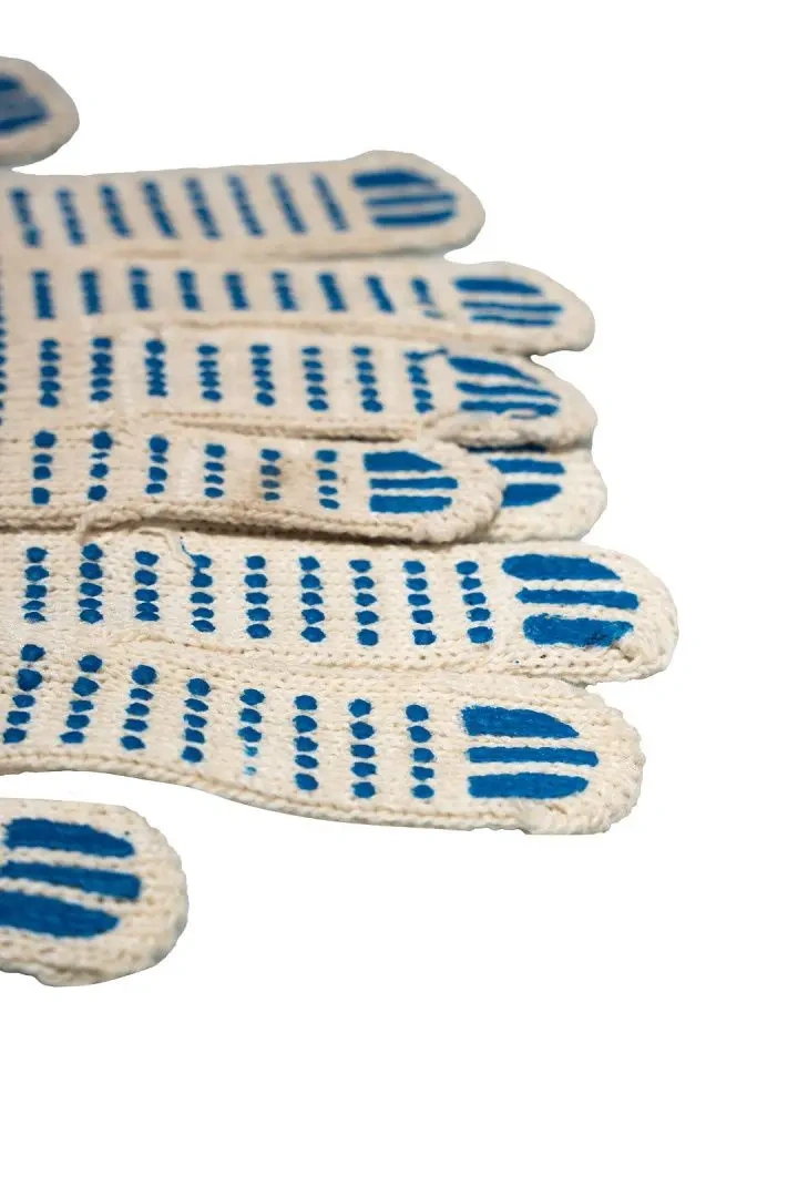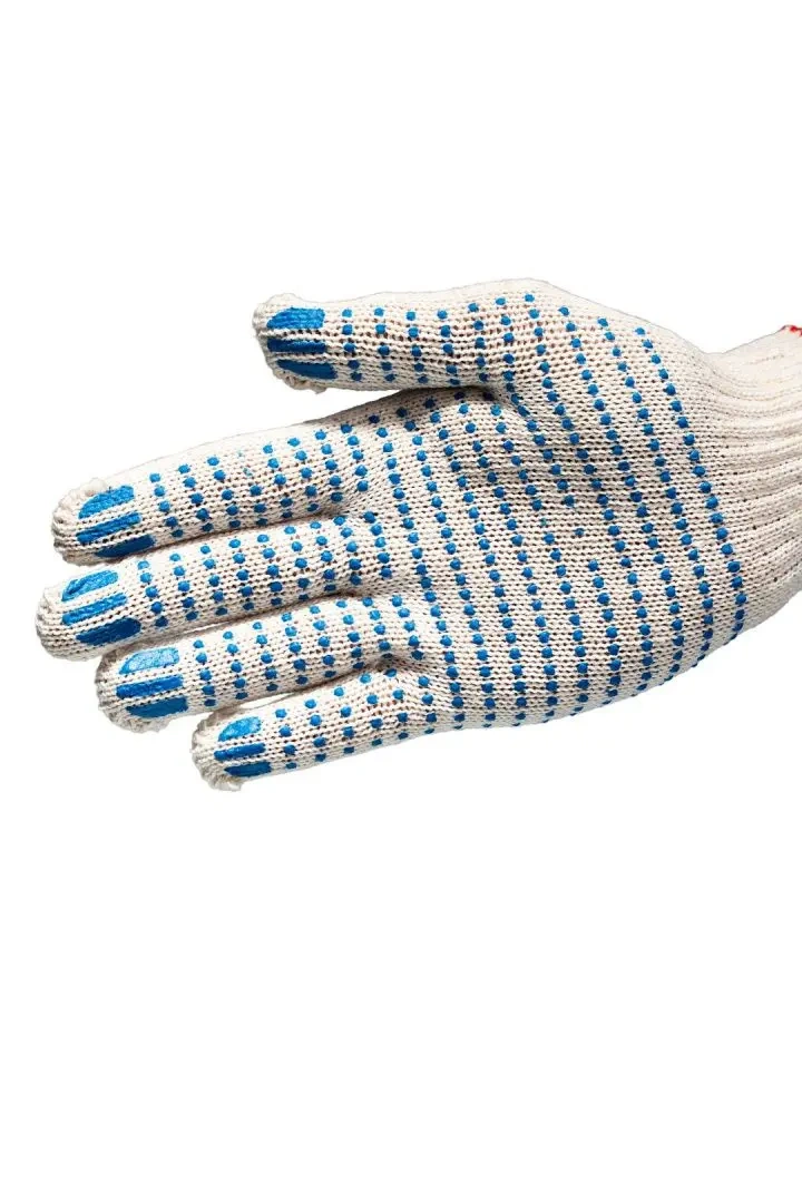 Перчатки х/б вязаные с ПВХ 4-х ниточные белыеПерчатки хлопчатобумажные с ПВХ нанесением предназначены для индивидуальной защиты рук при проведении:--хозяйственных и ремонтных работ,--работ на предприятии,--в условиях производства.Предохраняют руки от повреждений, попаданий заноз, грязи от порезов, дают повышенную защиту от внешних механических воздействий. Класс вязки -7,5Плотность - 1324 нитидлинна -21 смНанесение ПВХ -- точка