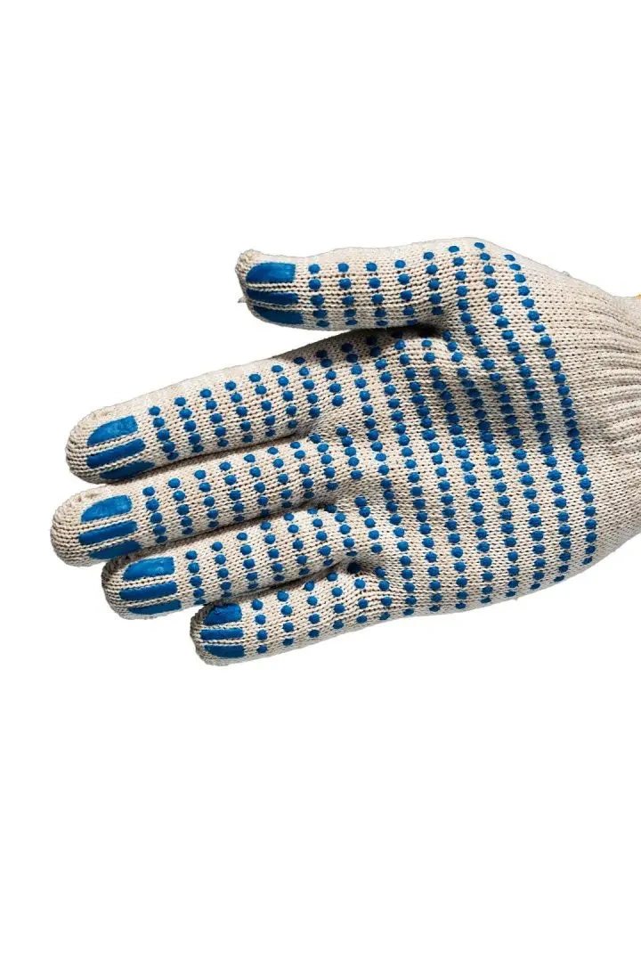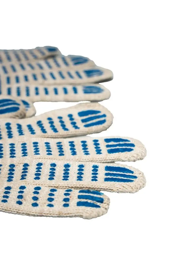 Перчатки х/б вязаные с ПВХ 5-ти ниточные белыеПерчатки хлопчатобумажные с ПВХ покрытием предназначены для индивидуальной защиты рук при проведении:--хозяйственных и ремонтных работ,--работ на предприятии,--в условиях производства.Предохраняют руки от повреждений, попаданий заноз, грязи от порезов, дают повышенную защиту от внешних механических воздействий. Класс вязки -10Плотность - 1325 нитейдлинна -21 смНанесение ПВХ -- точка Цвет -- Белый