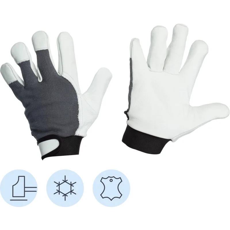 Кожаные рабочие перчатки предназначены для защиты рук от механических воздействий и низких температур. Модель сочетает в себе практичность, комфорт и надёжность благодаря использованию высококачественных материалов. Ладонь выполнена из коровьей кожи класса A, обеспечивающей отличную защиту от истирания, проколов и мелких порезов, а тыльная сторона изготовлена из хлопка, который пропускает воздух, но не пропускает пыль благодаря конструкции в форме «гармошки».