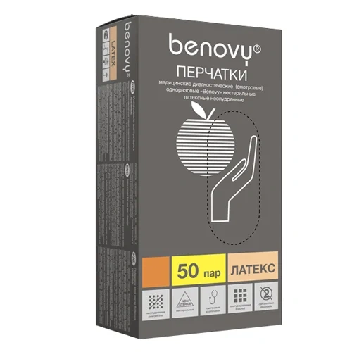 Перчатки медицинские диагностические (смотровые) одноразовые нестерильные Benovy из натурального латекса текстурированные неопудренные с однократной хлоринацией натурального цвета предназначены для одноразового использования в качестве защитного барьера при ношении на руках медицинского работника во время осмотра/лечения пациента или для других санитарных целей, используются в основном как двусторонний барьер для защиты пациента и медперсонала от различных загрязнений.