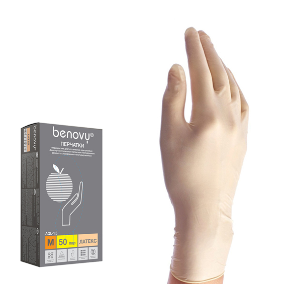 Перчатки медицинские диагностические (смотровые) одноразовые нестерильные Benovy из натурального латекса текстурированные неопудренные с двукратной хлоринацией натурального цвета предназначены для одноразового использования в качестве защитного барьера при ношении на руках медицинского работника во время осмотра/лечения пациента или для других санитарных целей, используются в основном как двусторонний барьер для защиты пациента и медперсонала от различных загрязнений.