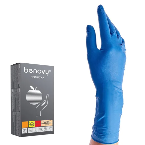 Перчатки медицинские диагностические (смотровые) одноразовые нестерильные Benovy из натурального латекса текстурированные неопудренные с однократной хлоринацией повышенной прочности синего цвета предназначены для одноразового использования в качестве защитного барьера при ношении на руках медицинского работника во время осмотра/лечения пациента или для других санитарных целей, используются в основном как двусторонний барьер для защиты пациента и медперсонала от различных загрязнений.