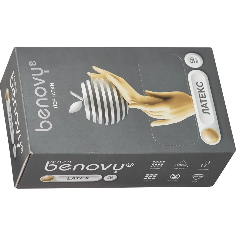 Перчатки медицинские диагностические (смотровые) одноразовые нестерильные Benovy из натурального латекса гладкие опудренные натурального цвета предназначены для одноразового использования в качестве защитного барьера при ношении на руках медицинского работника во время осмотра/лечения пациента или для других санитарных целей, используются в основном как двусторонний барьер для защиты пациента и медперсонала от различных загрязнений.