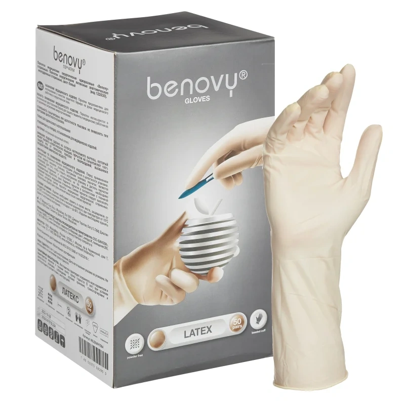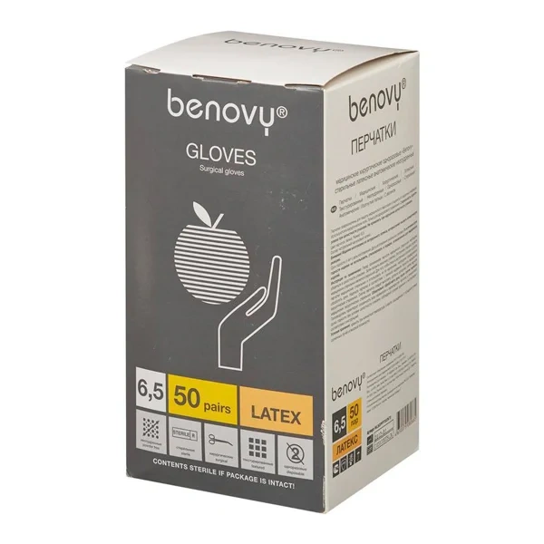 Перчатки латексные Benovy р.6.5, стерильные, неопудренные, ПАФ, 100 шт/уп