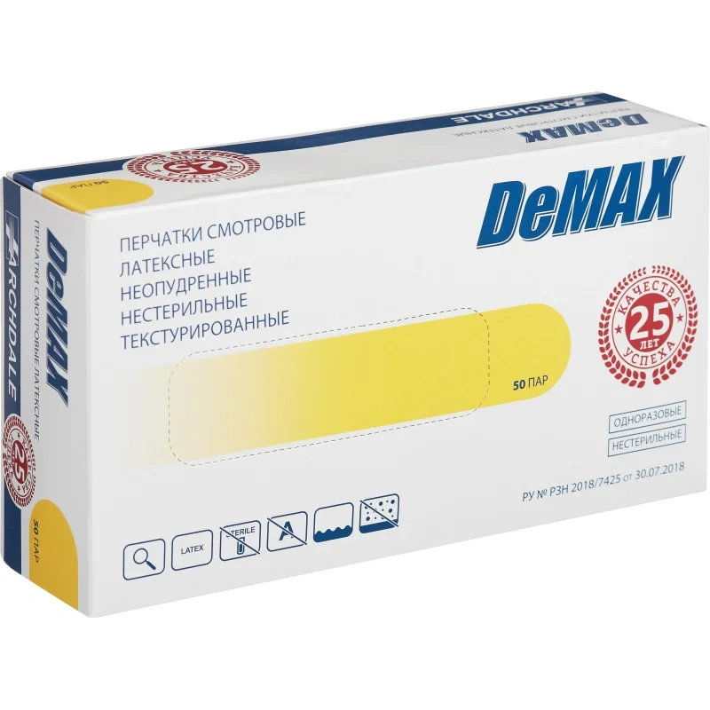 Перчатки латексные Demax р. М, белые, неопудренные, нестерильные, текстурные, 50 пар