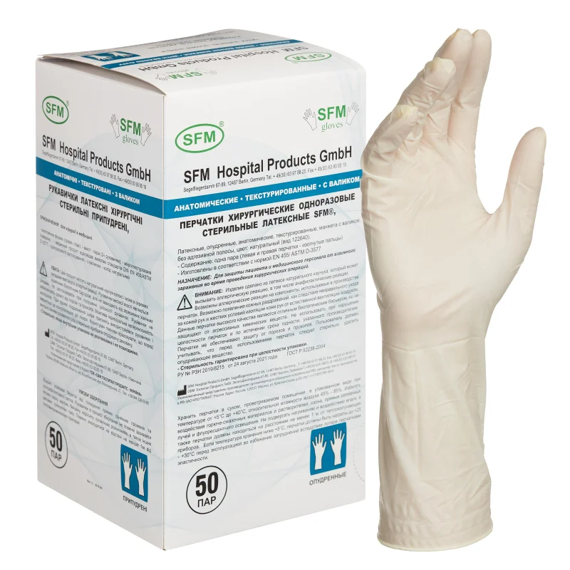 Мед.хирург. перчатки латекс. стерил. опудр. ПАФ SFM (7,0) 50пар/уп Производства SFM Hospital Products GmbH, Германия Предназначены для работ в медицинских, хирургических целях. Характеристики бело-желтого цвета, материал - латекс, назначение - хирургические, коэффициент AQL -1,0 , анатомические ( с разделения на правую и левую руки) , текстурированные, микрошероховатая поверхность по всей площади , опудренные, стерильные, манжета - с валиком, манжета - 290 мм -300 мм , толщина - 0,18-0,22 мм , стерилизация - оксид этилена, срок годности - 5 лет.Изделие сделано из латекса натурального каучука, который может вызвать аллергическую реакцию.
