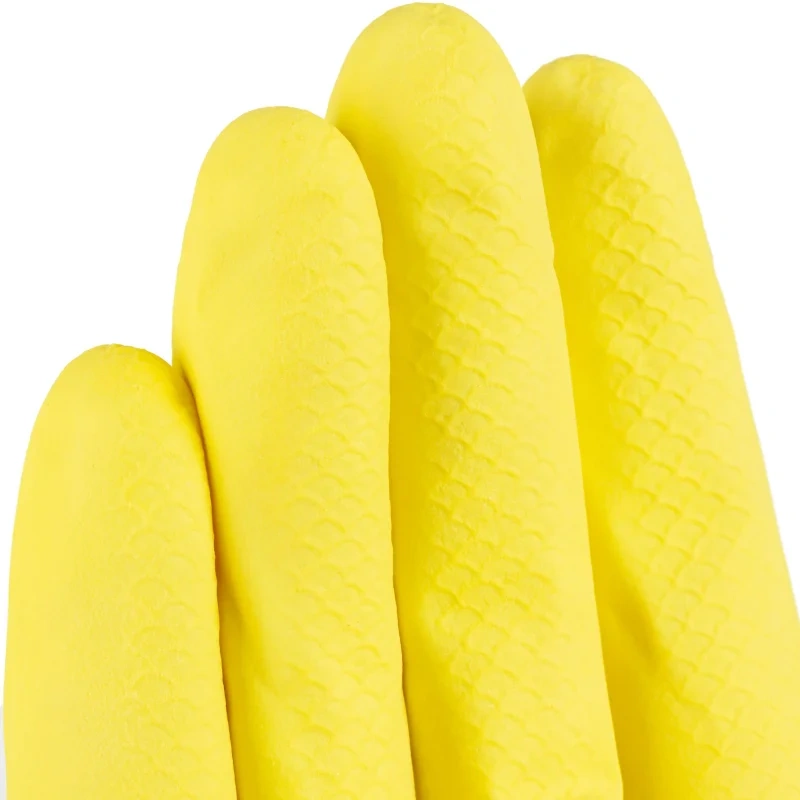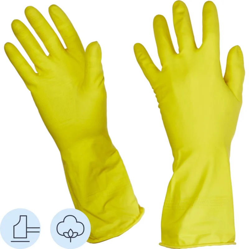 Перчатки хозяйственные латексные Luscan с внутренним хлопковым напылением, размер 7 (S). Вес пары: 30 г. Манжета — закатанный край. Текстурированная поверхность на пальцах и ладони для лучшего сцепления с поверхностью. Внутреннее хлопковое напыление способствует более легкому надеванию перчаток на руки. Закатанный край манжеты для фиксации перчатки на запястье также дополнительно усиливает прочность к разрывам и защищает от проникновения капель воды в перчатку. Предназначены для защиты рук от вредного воздействия агрессивных моющих и чистящих веществ во время уборки, стирки, мытья автомобиля, садовых работ. Поставляются в упаковке с европодвесом. Количество в упаковке 1 пара. Количество упаковок в транспортном коробе 240.