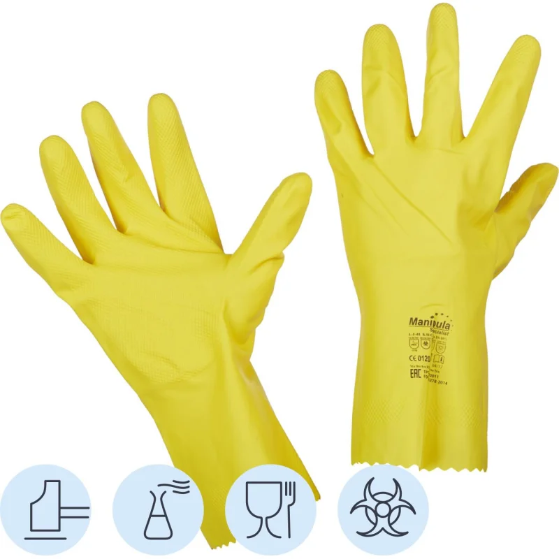 Перчатки Manipula Specialist Блеск L-F-01/CG-941 — герметичные латексные перчатки, рекомендованы для защиты рук от химических факторов (воды, кислот концентрацией до 50%, щелочей до 50%, органических растворителей (этанол, ацетон), растительных жиров), микроорганизмов и механических воздействий (истирание).