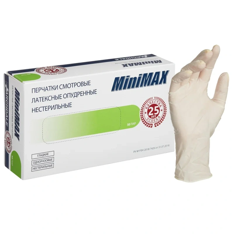 Перчатки латексные Minimax р. М, белые, опудренные, нестерильные, 50 пар