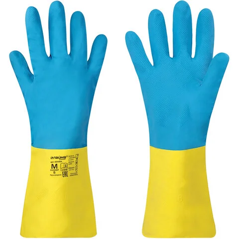 Надежное удержание скользких предметов благодаря рельефной текстуре. Неопреновая поверхность увеличивает механическую прочность, а также сохраняет гибкость и эластичность в холодных условиях. Перчатки толщиной 0,46 мм стандартного размера 8 (М) выполнены в синем и желтом цвете. Имеют подкладку с хлопковым напылением. Длина - 330 мм.