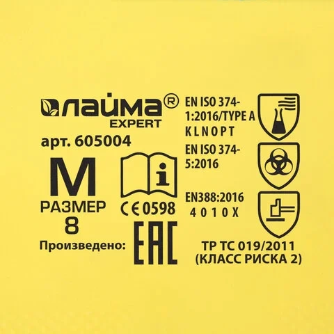 Изготовлены в соответствии с стандартами EN388: 2016, EN420: 2003+A1:2009, EN ISO 374-1:2016, EN374-2:2014, EN 16523-1:2015, EN 374-4:2013, EN ISO 374-5:2016, ГОСТ 12.4.278-2014.