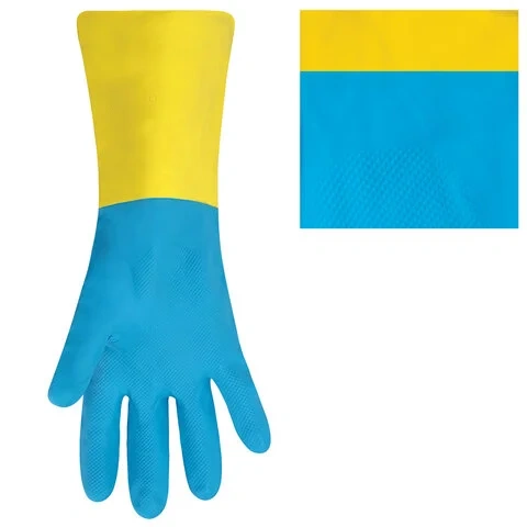 Надежное удержание скользких предметов благодаря рельефной текстуре. Неопреновая поверхность увеличивает механическую прочность, а также сохраняет гибкость и эластичность в холодных условиях. Перчатки толщиной 0,46 мм большого размера 9 (L) выполнены в синем и желтом цвете. Имеют подкладку с хлопковым напылением. Длина - 330 мм.