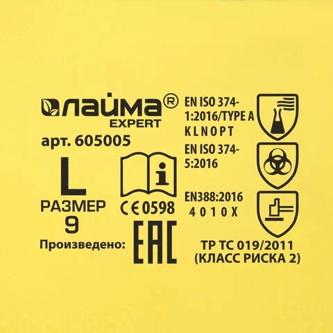 Изготовлены в соответствии с стандартами EN388: 2016, EN420: 2003+A1:2009, EN ISO 374-1:2016, EN374-2:2014, EN 16523-1:2015, EN 374-4:2013, EN ISO 374-5:2016, ГОСТ 12.4.278-2014.