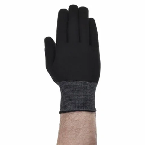 Нейлоновые перчатки черного цвета с нанесённой мягкой и цепкой ПВХ микроточкой.