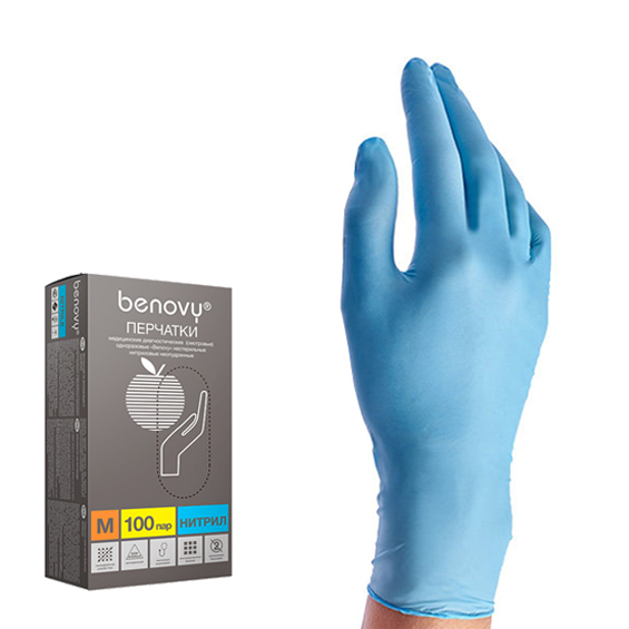 Перчатки медицинские диагностические (смотровые) одноразовые нестерильные Benovy нитриловые текстурированные на пальцах голубого цвета предназначены для одноразового использования в качестве защитного барьера при ношении на руках медицинского работника во время осмотра/лечения пациента или для других санитарных целей, используются в основном как двусторонний барьер для защиты пациента и медперсонала от различных загрязнений.