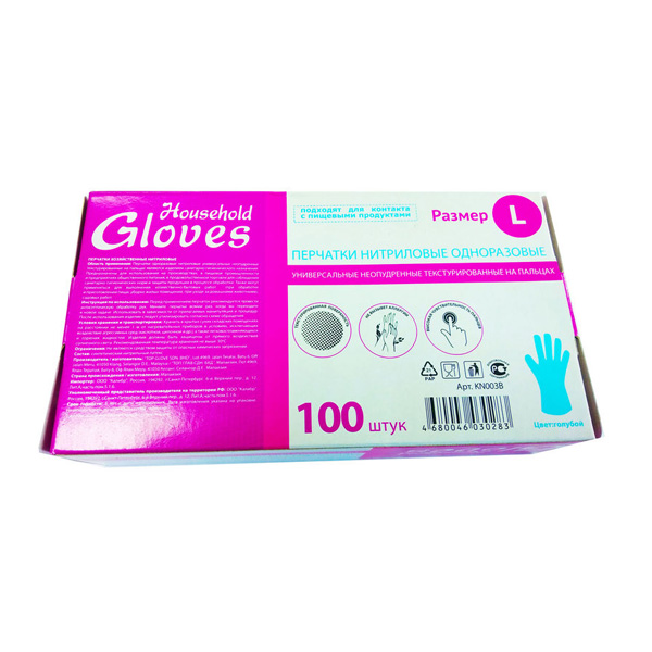 Перчатки нитриловые Household Gloves р.L, 6г, голубые, 50 пар