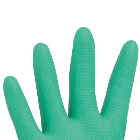 Надежное удержание скользких предметов благодаря рельефной текстуре. Перчатки толщиной 0,38 мм большого размера 9 (L) выполнены в зеленом цвете. Также могут применяться в пищевой промышленности. Имеют подкладку с хлопковым напылением. Длина - 330 мм.