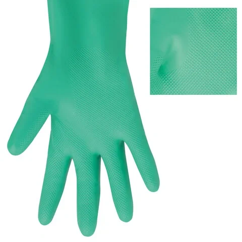 Надежное удержание скользких предметов благодаря рельефной текстуре. Перчатки толщиной 0,38 мм очень большого размера 10 (XL) выполнены в зеленом цвете. Также могут применяться в пищевой промышленности. Имеют подкладку с хлопковым напылением. Длина - 330 мм.