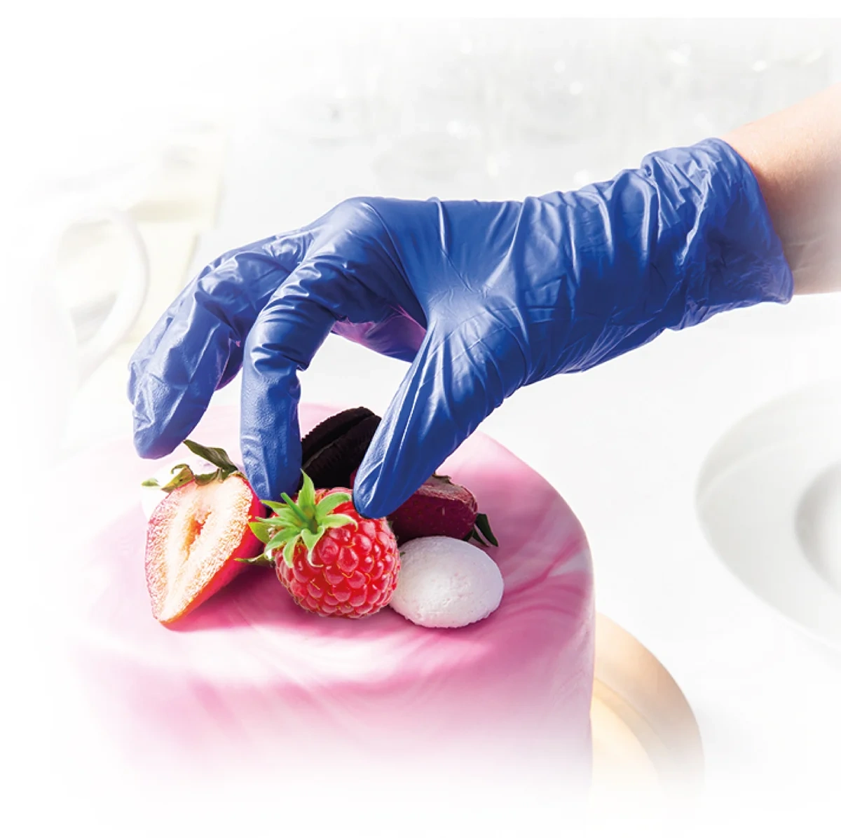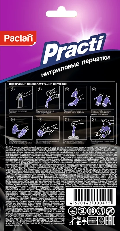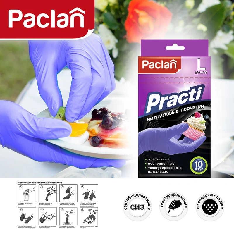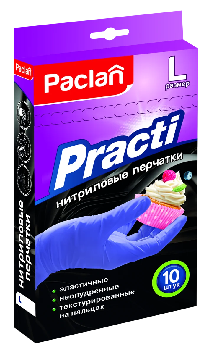 Перчатки Paclan нитриловые L, 10 шт. — идеальная защита рук во время приготовления пищи, уборки, косметических процедур. Это прочные и надежные изделия, которые отлично облегают руку. Они изготовлены из материала, который при контакте с пищей не выделяет вредных веществ, поэтому абсолютно безопасен для человека. Перчатки устойчивы к бытовым химическим растворам. Они не имеют запаха. Нитрил обеспечивает комфорт и высокую чувствительность пальцев. Изделия демонстрируют высокую устойчивость к проколам и натяжениям. Дополнительный ролик на манжете делает ее более прочной, облегчает надевание перчатки.