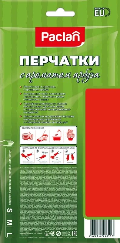 Перчатки Paclan с ароматом арбуза прекрасно подходят для защиты рук при выполнении хозяйственных работ по дому. Лёгкие и прочные, 100% хлопковое напыление. С ароматом арбуза, Яркий цвет перчаток. Сертифицированные. Рельефная поверхность ладони обеспечивает удобный захват и предотвращает выскальзывание предметов. Специальный каплеотбойник на манжете перчатки предотвращает протекание и попадание капель на кожу рук. Перчатки изготовлены из высокопрочного сырья, выдерживающего многократное использование. При повреждениях (проколы, порезы перчатки отверстия не расползаются. Предназначены для защиты рук при выполнении хозяйственных работ по дому. Рельефная поверхность ладони обеспечивает удобный захват и предотвращает выскальзывание предметов. Специальный каплеотбойник на манжете перчатки предотвращает протекание и попадание капель на кожу рук.