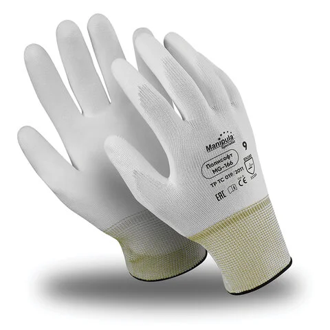 Перчатки рабочие защитные Manipula Specialist Полисофт MG-166 из полиэфира с полиуретаном полиуретановым покрытием белые (13 нитей, 13 класс, размер 9, L). Предназначены для защиты рук при выполнении различных работ в сферах пищевой, строительной и легкой промышленности, а также в других отраслях, где требуется механическая защита и хорошая тактильная чувствительность.