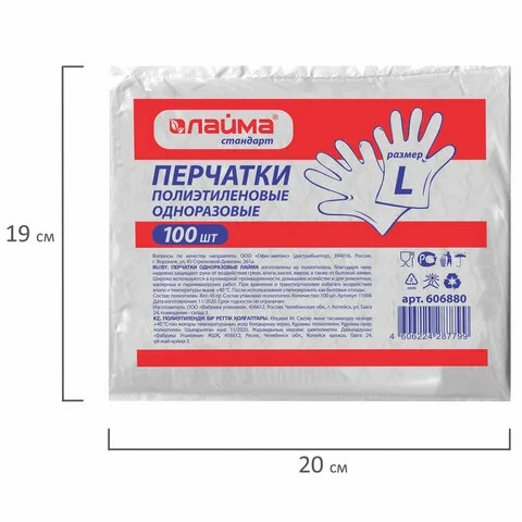 Одноразовые перчатки большого размера L выполнены из полиэтилена плотностью 6 микрон и имеют гладкий срез манжеты. Устойчивы к химическим средствам. Сохраняют тактильные ощущения. Отсутствие технической пудры на перчатках максимально уменьшает риск загрязнения как рук, так и продукции. 50 пар в упаковке. Поставляются в полиэтиленовом пакете.