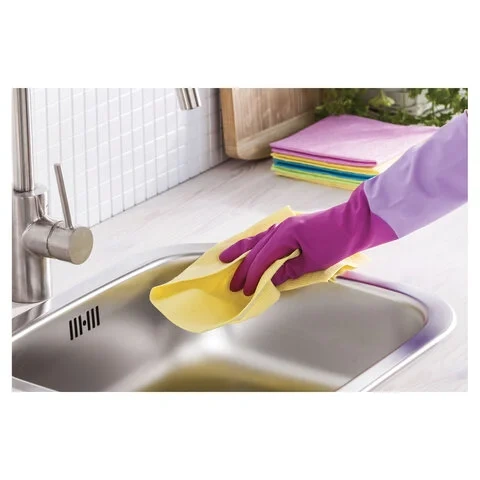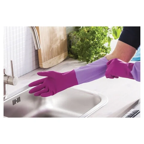 Прочные перчатки с нежным ароматом розы. Повышенная плотность и устойчивость к разрывам увеличивают срок службы. УДЛИНЕННАЯ МАНЖЕТА 38 СМ защищает руки от контакта с водой. Хлопковое напыление внутри обеспечивает максимальный комфорт во время уборки. Текстура на пальцах и ладони облегчает захват и повышает удобство использования. Нежный аромат розы сделает домашнюю уборку приятной. Яркая стилизованная упаковка - выделяется среди конкуретнов на полке! Состав: натуральный латекс.