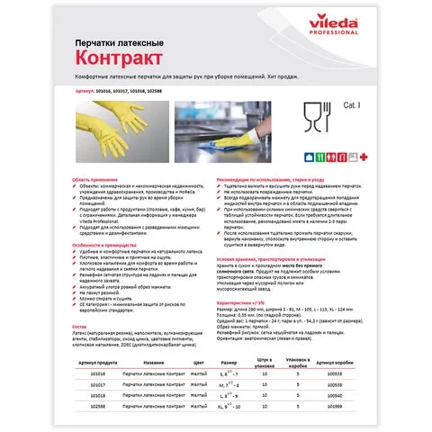 Перчатки Контракт от Vileda Professional из латекса, размер XL, предназначены для профессиональной уборки помещений с применением разведенных моющих средств и дезинфектантов. Подходят для работы с продуктами питания. Защищают от бактерий и вирусов. Перчатки Контракт эффективно защищают руки во время уборки. Подходят для использования с разведенными моющими средствами и дезинфектантами, работы с продуктами питания в столовых, кафе, барах и на кухнях.