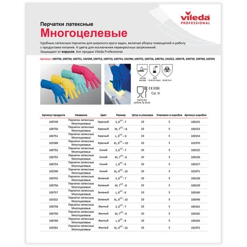 Перчатки Многоцелевые от Vileda Professional из латекса, размер XL, предназначены для профессиональной уборки и другого широкого круга задач, включая уборку помещений и работу с продуктами питания. Защищают от вирусов. Перчатки Многоцелевые эффективно защищают руки во время уборки. Подходят для использования с разведенными моющими средствами и дезинфектантами. Желтые и синие перчатки с ограничением подходят для работы с продуктами питания в столовых, кафе, барах и на кухнях. Применимы для работы на сухих и влажных участках.