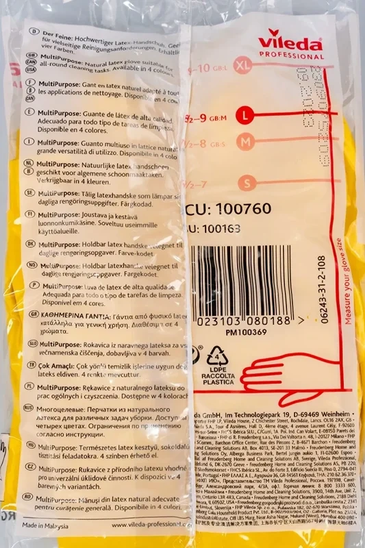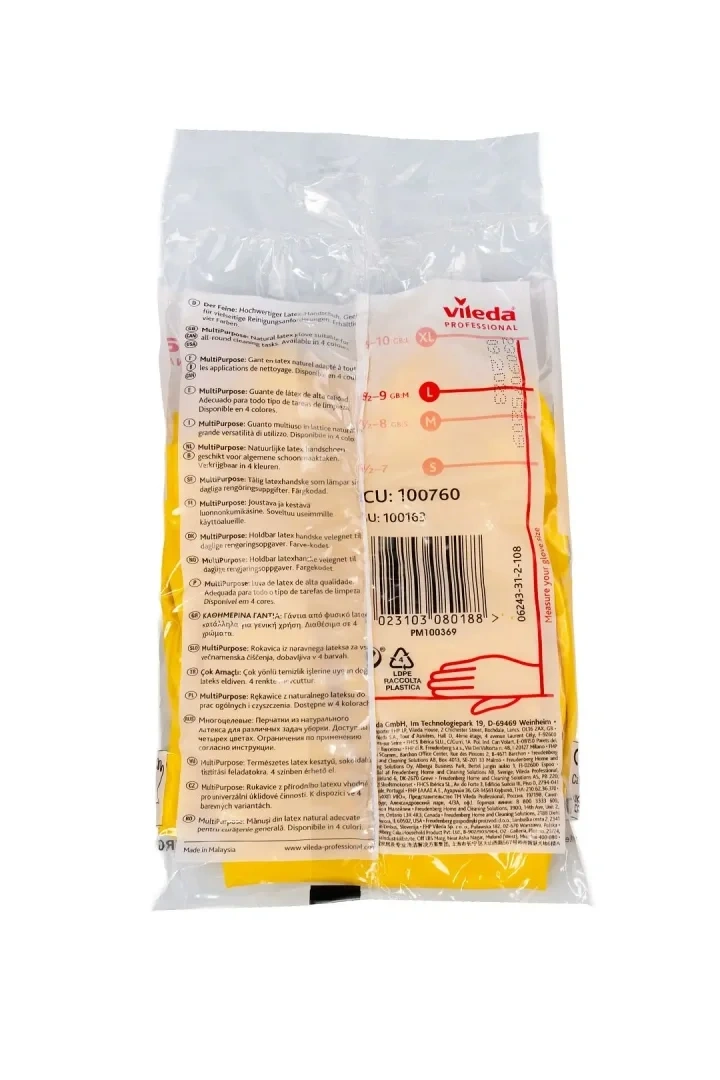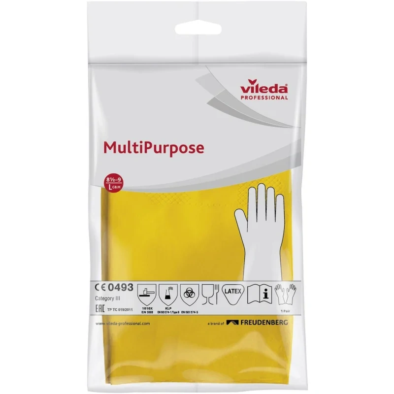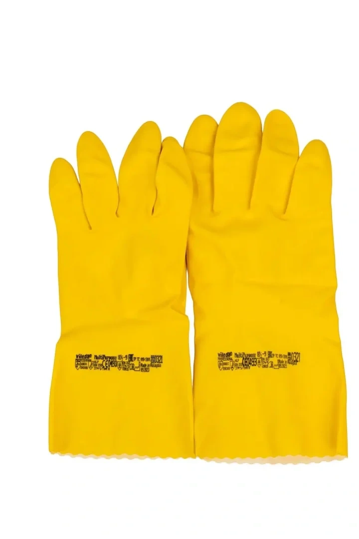 Перчатки Многоцелевые от Vileda Professional из латекса, размер L, предназначены для профессиональной уборки и другого широкого круга задач, включая уборку помещений и работу с продуктами питания. Защищают от вирусов. Перчатки Многоцелевые эффективно защищают руки во время уборки. Подходят для использования с разведенными моющими средствами и дезинфектантами. Желтые и синие перчатки с ограничением подходят для работы с продуктами питания в столовых, кафе, барах и на кухнях. Применимы для работы на сухих и влажных участках.