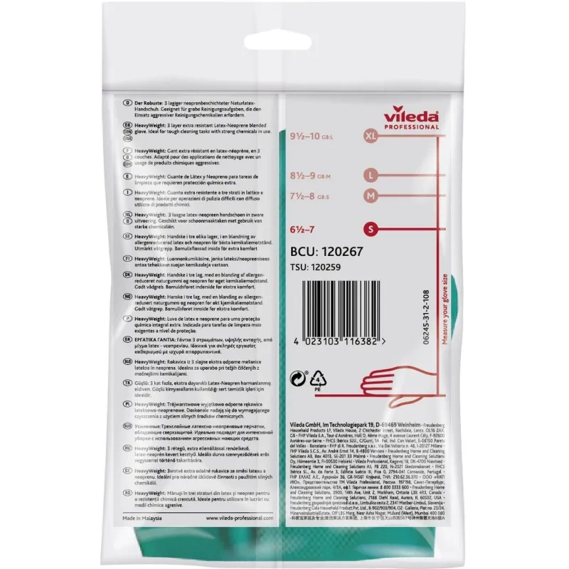 Перчатки Усиленные от Vileda Professional из латекса с неопреном, размер S, предназначены для профессиональной и генеральной уборки помещений с применением агрессивной химии и сильнодействующих моющих средств. Особо прочные и долговечные трехслойные перчатки имеют неопреновую обработку. Защищают от бактерий и вирусов. Перчатки Усиленные усиленно защищают руки во время уборки. Подходят для использования с агрессивной химией, сильнодействующими и разведенными моющими средствами и дезинфектантами. Применимы для работы на сухих и влажных участках.