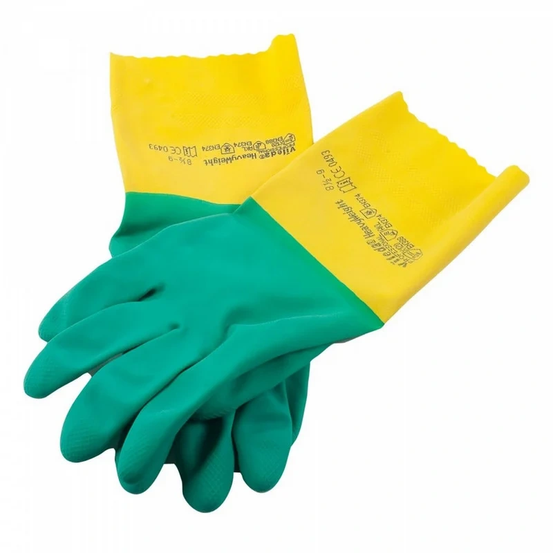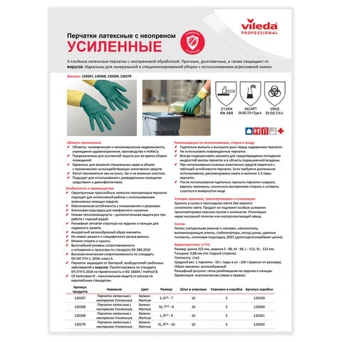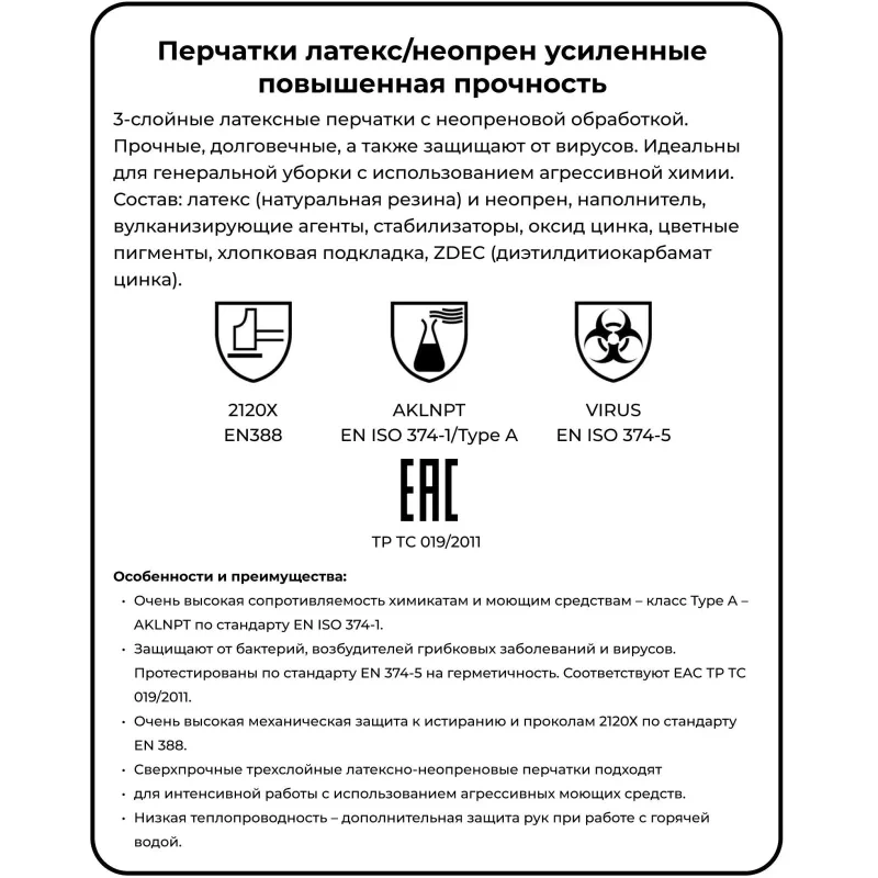 Особенности и преимущества: Очень высокая сопротивляемость химикатам и моющим средствам — класс Type A — AKLNPT по стандарту EN ISO 374-1. Очень высокая механическая защита к истиранию и проколам 2120Х по стандарту EN 388. Защищают от бактерий, возбудителей грибковых заболеваний и вирусов. Протестированы по стандарту EN 374-5 на герметичность. Соответствуют EAC ТР ТС 019/2011. Сверхпрочные трехслойные латексно-неопреновые перчатки подходят для интенсивной работы с использованием агрессивных моющих средств. Очень высокая устойчивость к изнашиванию и разрывам. Хлопковое напыление для комфортного ношения. Низкая теплопроводность — дополнительная защита рук при работе с горячей водой.