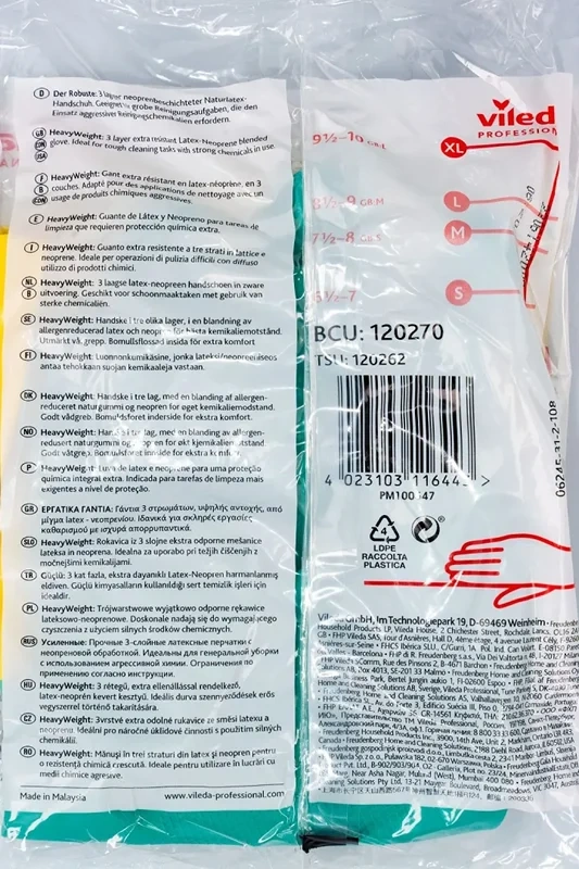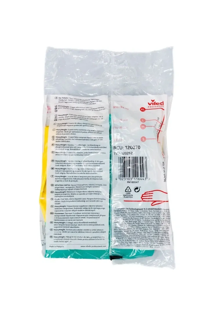 Перчатки Усиленные от Vileda Professional из латекса с неопреном, размер XL, предназначены для профессиональной и генеральной уборки помещений с применением агрессивной химии и сильнодействующих моющих средств. Особо прочные и долговечные трехслойные перчатки имеют неопреновую обработку. Защищают от бактерий и вирусов. Перчатки Усиленные усиленно защищают руки во время уборки. Подходят для использования с агрессивной химией, сильнодействующими и разведенными моющими средствами и дезинфектантами. Применимы для работы на сухих и влажных участках.