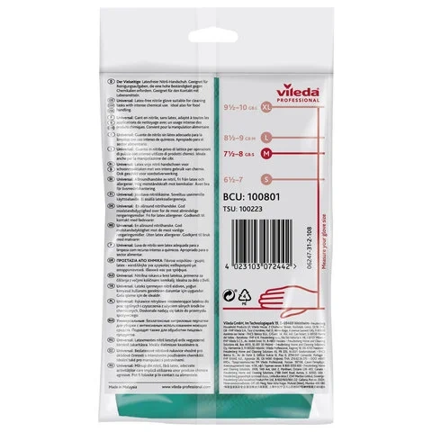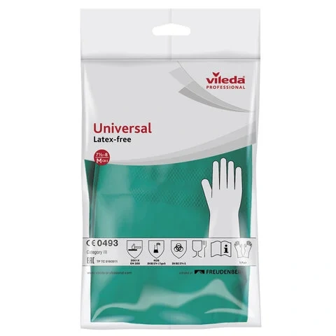 Перчатки нитриловые Универсальные от Vileda Professional, размер М, предназначены для профессиональной уборки с интенсивным применением моющих средств. Подходят для работы с продуктами питания. Защищают от бактерий и вирусов. Не содержат латекса. Перчатки Универсальные эффективно защищают руки во время уборки. Подходят для использования с разведенными моющими средствами и дезинфектантами, работы с продуктами питания в столовых, кафе, кухнях, ресторанах и барах. Применимы для работы на сухих и влажных участках.