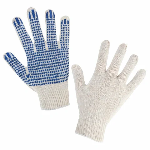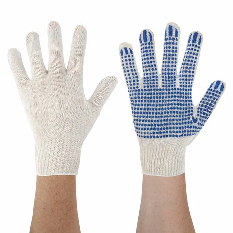 Изготовлены из хлопчатобумажной пряжи плотностью 83 текс с покрытием из поливинилхлорида с нанесением рисунка на внутреннюю сторону перчатки. Покрытие ПВХ помогает обеспечить плотный захват и предотвращает соскальзывание детали. Резинки на манжетах обеспечивают плотное прилегание перчатки к руке. Перчатки белого цвета имеют 10 класс вязки. Вес пары - 32-34 г. Поставляются в комплекте 100 штук в полиэтиленовой упаковке.