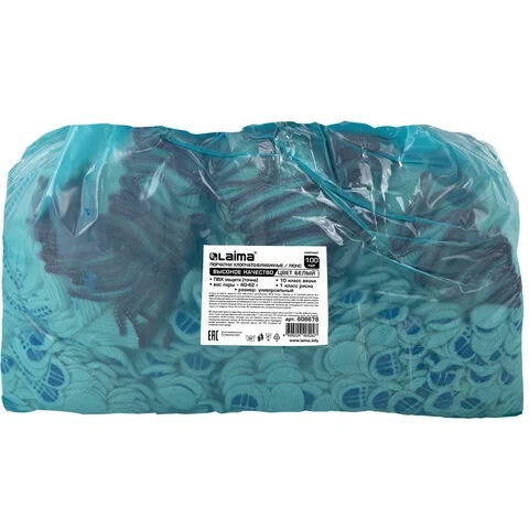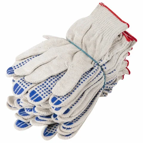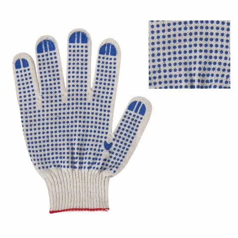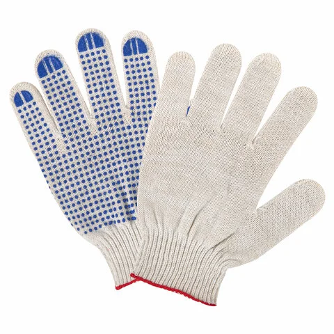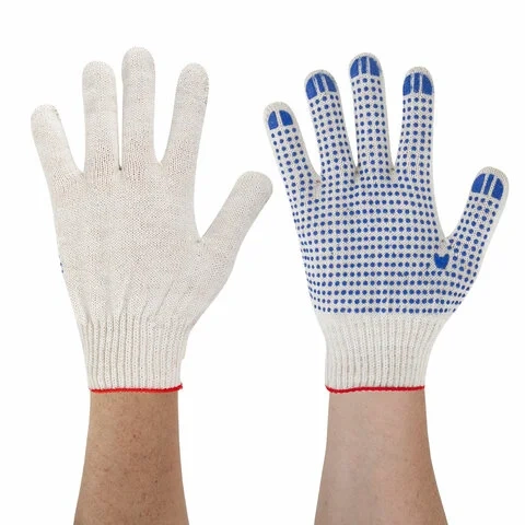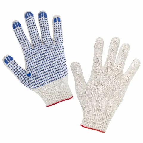 Изготовлены из хлопчатобумажной пряжи плотностью 116 текс с покрытием из поливинилхлорида с нанесением рисунка на внутреннюю сторону перчатки. Покрытие ПВХ помогает обеспечить плотный захват и предотвращает соскальзывание детали. Резинки на манжетах обеспечивают плотное прилегание перчатки к руке. Перчатки белого цвета имеют 10 класс вязки. Вес пары - 40-42 г. Поставляются в комплекте 100 штук в полиэтиленовой упаковке.