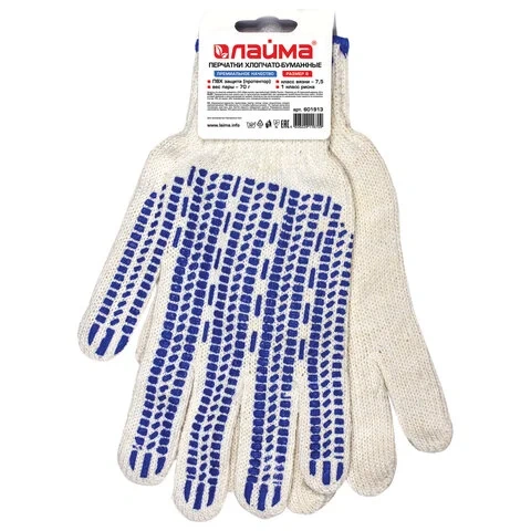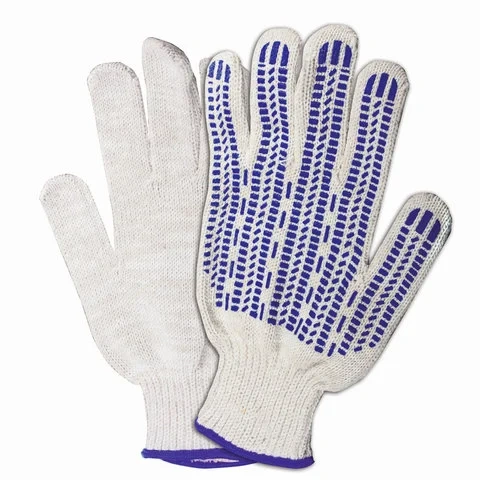 Изготовлены из хлопчатобумажной пряжи плотностью 233 текс с покрытием из поливинилхлорида с нанесением рисунка на внутреннюю сторону перчатки. Покрытие ПВХ помогает обеспечить плотный захват и предотвращает соскальзывание детали. Резинки на манжетах обеспечивают плотное прилегание перчатки к руке. Перчатки белого цвета имеют 7 класс вязки. Вес пары - 70 г. Индивидуальная упаковка.