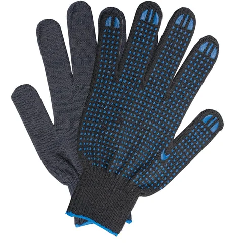 Изготовлены из хлопчатобумажной пряжи плотностью 116 текс с покрытием из поливинилхлорида с нанесением рисунка на внутреннюю сторону перчатки. Покрытие ПВХ помогает обеспечить плотный захват и предотвращает соскальзывание детали. Резинки на манжетах обеспечивают плотное прилегание перчатки к руке. Перчатки черного цвета имеют 10 класс вязки. Вес пары - 40-42 г. Поставляются в комплекте 5 штук в полиэтиленовой упаковке.