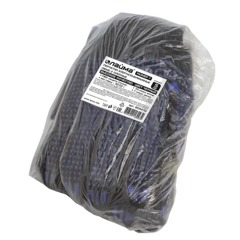 Изготовлены из хлопчатобумажной пряжи плотностью 133 текс с покрытием из поливинилхлорида с нанесением рисунка на внутреннюю сторону перчатки. Покрытие ПВХ помогает обеспечить плотный захват и предотвращает соскальзывание детали. Резинки на манжетах обеспечивают плотное прилегание перчатки к руке. Перчатки черного цвета имеют 10 класс вязки. Вес пары - 50-52 г. Поставляются в комплекте 5 штук в полиэтиленовой упаковке.