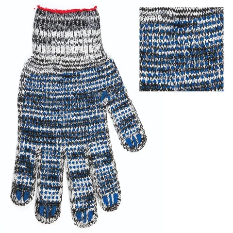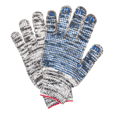 Изготовлены из хлопчатобумажной пряжи плотностью 216 текс с покрытием из поливинилхлорида с нанесением рисунка на внутреннюю сторону перчатки. Покрытие ПВХ помогает обеспечить плотный захват и предотвращает соскальзывание детали. Резинки на манжетах обеспечивают плотное прилегание перчатки к руке. Перчатки серо-белого цвета имеют 7 класс вязки. Вес пары - 60-62 г. Поставляются в комплекте 5 штук в полиэтиленовой упаковке.