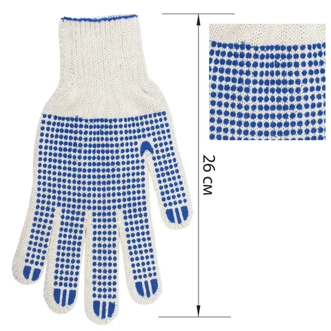 Изготовлены из хлопчатобумажной пряжи плотностью 216 текс с покрытием из поливинилхлорида с нанесением рисунка на внутреннюю сторону перчатки. Покрытие ПВХ помогает обеспечить плотный захват и предотвращает соскальзывание детали. Резинки на манжетах обеспечивают плотное прилегание перчатки к руке. Перчатки белого цвета имеют 7 класс вязки. Вес пары - 65-67 г. Поставляются в комплекте 5 штук в полиэтиленовой упаковке.