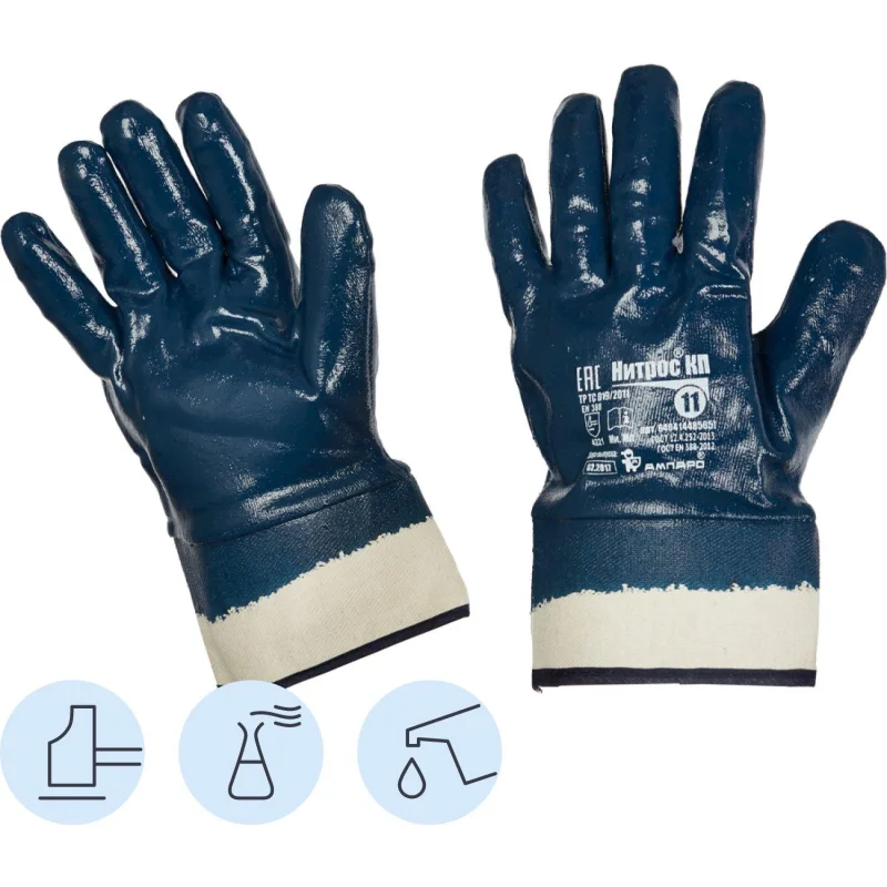 Трикотажные рабочие перчатки х/б Нитрос КП с полным нитриловым покрытием, размер 11 (XXL), предназначены для тяжелых работ с металлоконструкциями, строительными, абразивными и другими материалами. Также подходят для работы с различными инструментами. Перчатки эффективно защищают от воздействия минеральных масел, кислот, щелочей, нефти, нефтепродуктов и воды.