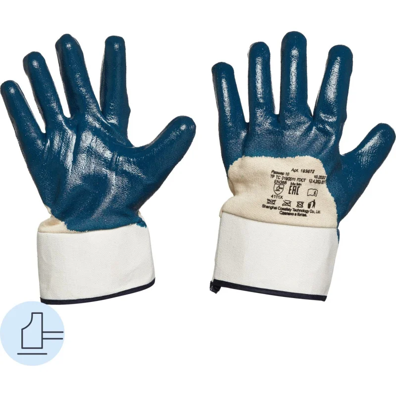 Перчатки рабочие защитные хлопковые с нитрильным покрытием белые/синие (неполный двойной облив, манжета крага, размер 10 (XL)). Трикотажные рабочие перчатки с неполным двойным нитриловым обливом и манжетой-крагой предназначены для защиты рук при выполнении работ с грубыми и жесткими поверхностями, а также с абразивными материалами. Эти перчатки обеспечивают надежную защиту от загрязнений, смазочных материалов и продуктов нефтепереработки.
